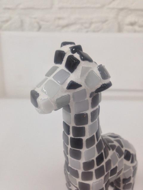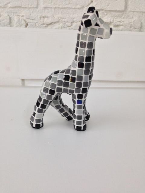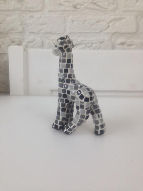 Fermijn Mozaïek, giraf, 17cm, grijs/zwart. Deze giraf is handgemaakt, hierdoor is dit mozaïekwerk uniek. Het is gemaakt van glasmozaïek in grijze en zwarte tinten. Erg leuk voor in de baby/kinderkamer en een aanwinst voor uw interieur. De giraf is ook verkrijgbaar in meerdere kleuren. De onderkant van de voetjes zijn afgewerkt met bijpassend gekleurd vilt.