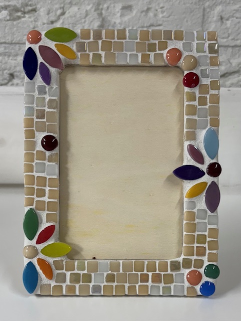 Inhoud pakket: Voorbeeld foto, fotolijstje (19 x 14 cm), zakjes met mozaïek steentjes, lijm, voegmiddel en werk- en voeginstructie.