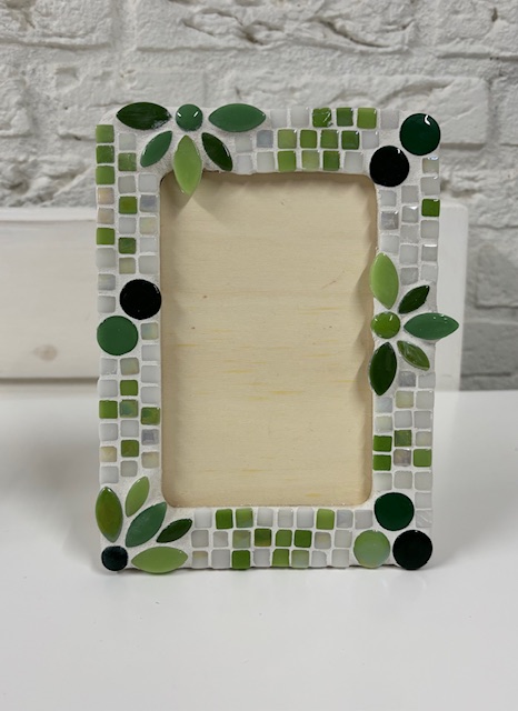 Inhoud pakket: Voorbeeld foto, fotolijstje (19 x 14 cm), zakjes met mozaïek steentjes, lijm, voegmiddel en werk- en voeginstructie.