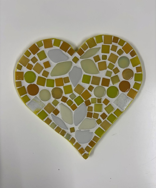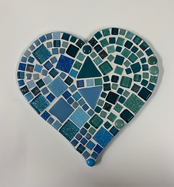 Dit hart hebben we in verschillende kleuren. We werken met glas mozaïek, dit zijn kant en klare steentjes, zonder scherpe randjes, in verschillende maten en vormen.