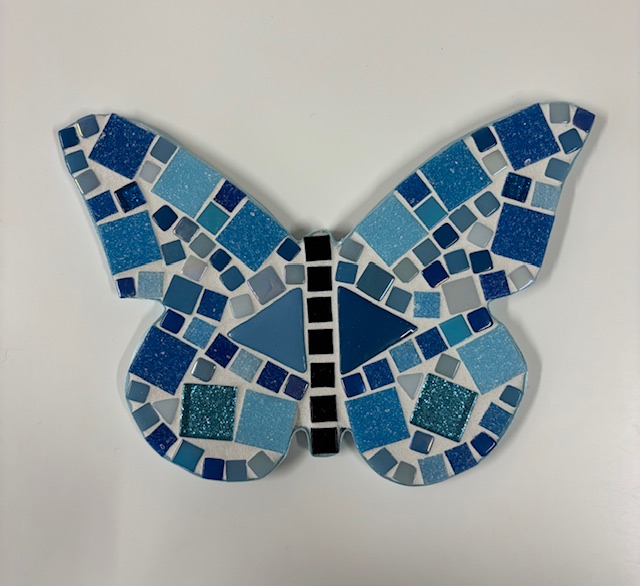 Deze vlinder hebben we in verschillende kleuren. We werken met glas mozaïek, dit zijn kant en klare steentjes, zonder scherpe randjes, in verschillende maten en vormen.