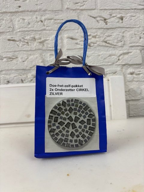 Dit Onderzetter-pakket hebben we in verschillende kleuren en in verschillende vormen. We werken met glas mozaïek, dit zijn kant en klare steentjes, zonder scherpe randjes, in verschillende maten en vormen. Er hoeft niet geknipt te worden.