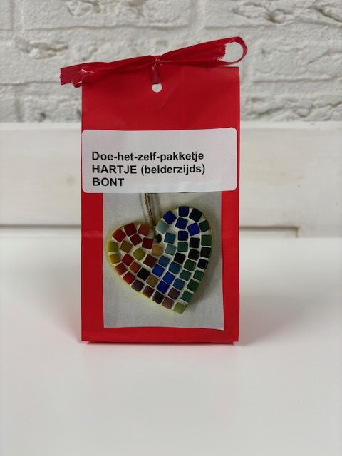 Inhoud pakketje: hartje, zakje mozaïek steentjes, lijm, wit voegmiddel, afwerklint, ophangtouwtje, werkinstructie (met voorbeeld foto’s) en voeginstructie.